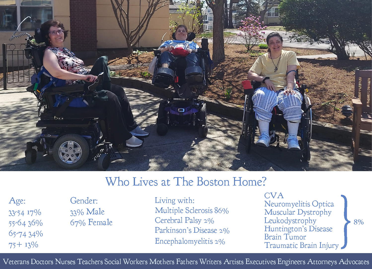 Founded in 1881, The Boston Home serves adults with advanced Multiple Sclerosis and other progressive neurological disorders. Exceptional clinical care, compassion, and innovative programs have earned us the designation “Center for Excellence in Long-term Care” from the National Multiple Sclerosis Society. The Boston Home is the only facility of its kind in New England and only one of a handful nationwide.